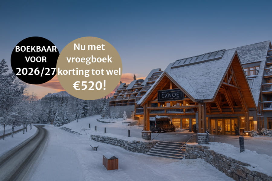 Hotel Canoe & Suites is één van de eerste dingen die je ziet als je vanaf Calgary Banff in rijdt. Dit moderne en stijlvol ingerichte hotel ligt direct aan de grote hoofdstraat Banff Avenue, en geniet daarmee van een makkelijke locatie voor wintersporters, als eerste instappunt op de route is er altijd plek in de skibus! In 10 á 15 minuutjes lopen ben je in het centrum van Banff, waar je oneindig keuze hebt aan winkels, restaurants en café’tjes, maar voor een hapje eten kan je ook heel goed terecht direct bij Hotel Canoe in het restaurant Sudden Sally. Het uitzicht vanaf de hot tubs op het dakterras is een absolute aanrader!*Korting afhankelijk van vertrekdatum. Niet geldig op vertrek tussen 18/12/2026-02/01/2027. Geldig op boekingen tot 31/08/2026.**Korting alleen geldig voor vertrek op 19/02/2027 en retour op 26/02/2027, en alleen geldig bij boekingen met Air Canada vluchten. Korting wordt automatisch verrekend in totaalprijs.De inbegrepen skiliftpassen zijn inclusief transfers tussen alle drie skiresorts, zodat je gemakkelijk de omgeving kan verkennen. Naar keuze wordt er gevlogen met Air Canada (via Toronto) of KLM (direct) naar Calgary, en skibagage is gratis inbegrepen! Na aankomst word je met de transfer in circa 2 uur naar Banff gebracht wordt.Bij dit hotel zijn op aanvraag ook condo`s met 3 slaapkamers beschikbaar.FaciliteitenRooftop hot tubs met waterval en vuurkorfEigen restaurant: Sudden SallyRoomserviceSaunaGratis Wi-FiGratis parkeren24-uursreceptieGratis buspassenHondvriendelijke kamers Extra`sOm jouw wintersportvakantie in Banff compleet te maken kan je de volgende activiteiten bijboeken:Skiliftpassen (inbegrepen)SkihuurSledetocht in BanffHuskysafari vanaf Lake LouiseNightrise bij de Banff GondolaHeli-Skiing vanaf BanffSneeuwschoenwandeling naar Paint Pots vanaf BanffIJswandeling door Johnston CanyonOntdek Banff & Wildlife TourIJsklimmen vanaf Banff
