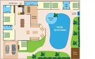 De villa is smaakvol ingericht en van alle gemakken voorzien, een grote L-vormige woonkamer (80m2), ruime keuken (20m2), 6 slaapkamers en 5 badkamers. De woonkamer is voorzien van een flat TV, surround set, 2 ruime banken en 2 grote losse fauteuils. Een boekenkast voor uren leesplezier en een ruime eettafel voor 8-10 personen. Onze keuken is voorzien van een grote ijskast, ijsmachine, vriezer, gaskookplaat, rijstkoker, toaster, koffiezetapparaat, magnetron en wasmachine.