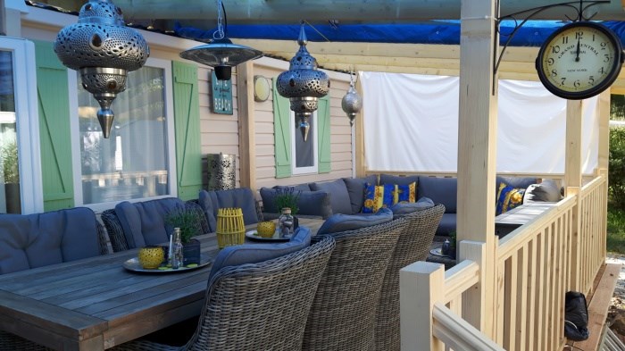De Mobilhomes zijn zeer compleet ingericht oa, airco door de gehele caravan,2 of 3 slaapkamers, douche, binnen keuken, buitenkeuken, afwasmachine, mooie grote buitenplaats, met tafels en stoelen en ligbedden, badkamer met wastafel, toilet, radio, cd, dvd en Nederlandse flat screen tv.