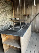 Het (deels) overdekte en omheinde terras heeft een jacuzzi, een BBQ en vuurkorf, en een veilige plaats voor de fietsen.