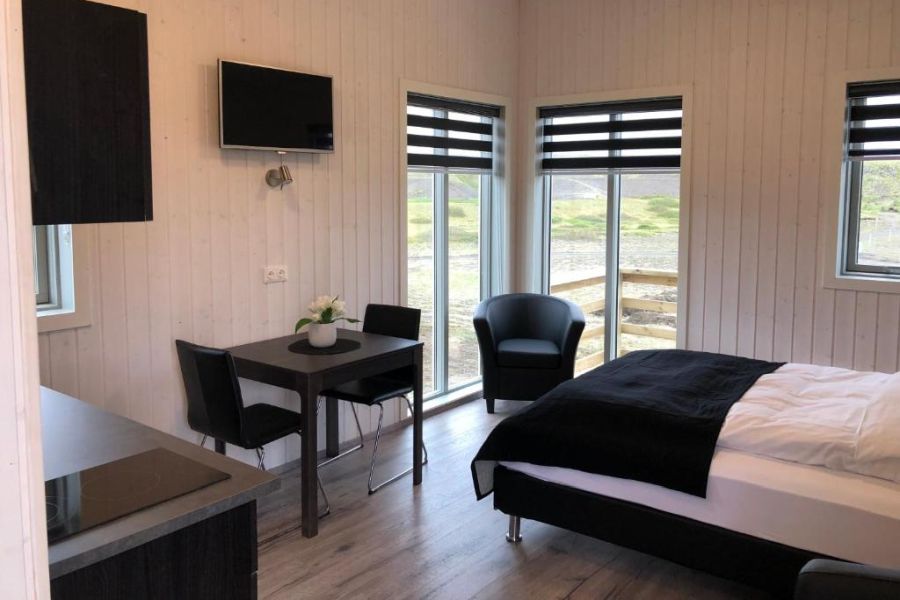 Deze in 2018 gebouwde cottages zijn zeer rustig gelegen op 30 km. afstand van Hella en de ringweg. Uitzicht op de Hekla vulkaan en een riviertje. De 3 studio cottages (25 m2) zijn geschikt voor 2 personen en beschikken over een 2-persoonsbed, 2 kuipstoelen, eettafel en flatscreen TV met Netflix. Kitchenette met koelkast, 2-pits kookplaat en koffiezetapparaat, waterkoker en broodrooster. Gratis koffie/thee, gratis wifi. Moderne badkamer met wastafel, douche, toilet en haardroger. Bedlinnen en eindschoonmaak zijn inclusief. Ideaal voor mensen die rust zoeken en graag "in the middle of nowhere" willen verblijven. ’s Winters is dit een erg goede plek voor het zien van het noorderlicht. Winkels en restaurants in Hella op 30 km afstand. Reykjavik 122 km, Vik 117 km.