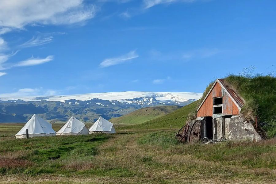 Bij de Farmhouse Lodge, vlakbij het zwarte strand van Vik, kun je van 1/6-20/9 verblijven in luxe canvas tenten. De tenten voor 2 personen hebben een 2-persoonsbed, de 4-persoonstenten hebben een 2-persoonsbed en twee 1-persoonsbedden, die zijn voorzien van bedverwarming, electriciteit, lamp en dekens. In The Barn, een grote schuur, zijn een bar, banken, tafels en een gemeenschappelijke keuken, waar je zelf kunt koken. Tafeltennistafel, dartboard en spelletjes beschikbaar. Gratis koffie/thee, wifi en bagagelockers. Gemeenschappijke douches/toiletten. Optioneel kun je het ontbijt bijboeken in het guesthouse. 10 minuten rijden van Vik, het meest zuidelijke punt van IJsland. Parkeerplaats. Het zwarte strand van Reynisfjara ligt op 7 km afstand. Op de Solheimajökull kun je een gletsjerwandeling maken met een gids. Ook interessant is het vliegtuigwrak van een DC3 toestel, dat al jarenlang in de Solheimasandur zandvlakte ligt of een excursie naar een ijsgrot. Sneeuwscootertochten mogelijk op de Myrdalsjökull. 8 km van de Dyrholaey kaap waar veel zeevogels nestelen. Restaurants, zwembad en 9-hole golfbaan in Vik (14 km). Reykjavik 170 km.