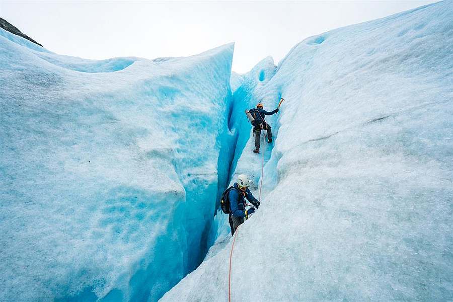 Het Folgefonni Gletsjerteam neemt je mee op een begeleide ijswandeling op de Juklavass-gletsjer. Deze gletsjerarm van de Folgefonna bestaat deels uit vlakke ijsoppervlakken, deels uit wat veeleisendere delen met spleten. De hikes worden aangepast aan de wensen en vaardigheden van de deelnemers. Breng warme, wind- en waterdichte kleding, handschoenen en wandelschoenen mee. Zonnebril en zonnebrandcrème zijn ook noodzakelijk, net als voldoende eten en drinken en een dagrugzak met ruimte voor de gletsjeruitrusting. Stijgijzers, ijsbijlen, klimgordels, helmen, touwen en wandelschoenen zijn bij de prijs inbegrepen.Blue Ice hikeVan juni tot oktober wordt de Blue Ice hike dagelijks aangeboden. De reis begint bij het Fonna Summer Ski Centre, 19 km van Jondal en de Hardangerfjord. De gletsjertocht duurt 5-6 uur, inclusief lunchpauze met panoramisch uitzicht over het gletsjerlandschap, de Noordzee en de Rosendal Alpen. Tijdens de hike leer je van de gids over de lokale culturele geschiedenis, het klimaat en de gletsjer zelf. In de middag keer je terug naar het skicentrum, dan met uitzicht op het prachtige fjordenlandschap.