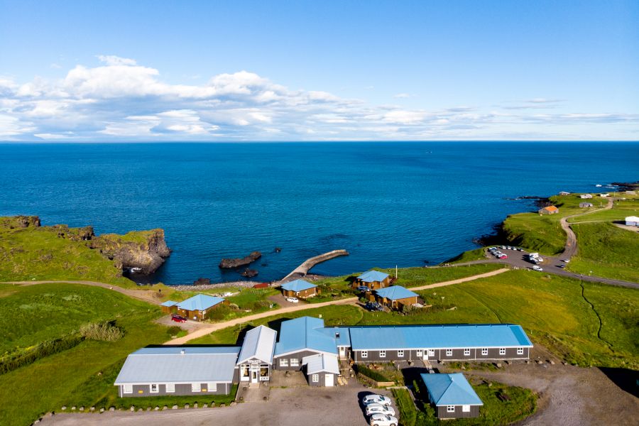 Country hotel, prachtig gelegen aan de voet van de Snaefellsjökull gletsjer en vulkaan. Je kunt een kustwandeling maken langs het strand en lavavelden naar Arnarstapi, met fraaie rotsformaties, waar veel vogels nestelen. 39 Kamers met douche, toilet, haardroger en flatscreen TV, verspreid over verschillende gebouwen. Gratis wifi, bar, lounge met bibliotheek, goed restaurant. Het eco vriendelijke hotel heeft een Green Globe21 certificaat voor duurzaamheid en het bewust omgaan met ons milieu. Vlakbij het hotel ligt het Visitor Centre van het Snaefellsjökull National Park. Op de Snaefellsjökull kun je met een snowcat tochten maken naar de top van de gletsjer. Vanuit Olafsvik (40 km.) vertrekken walvisexcursies. Geopend van 1/4-31/10.