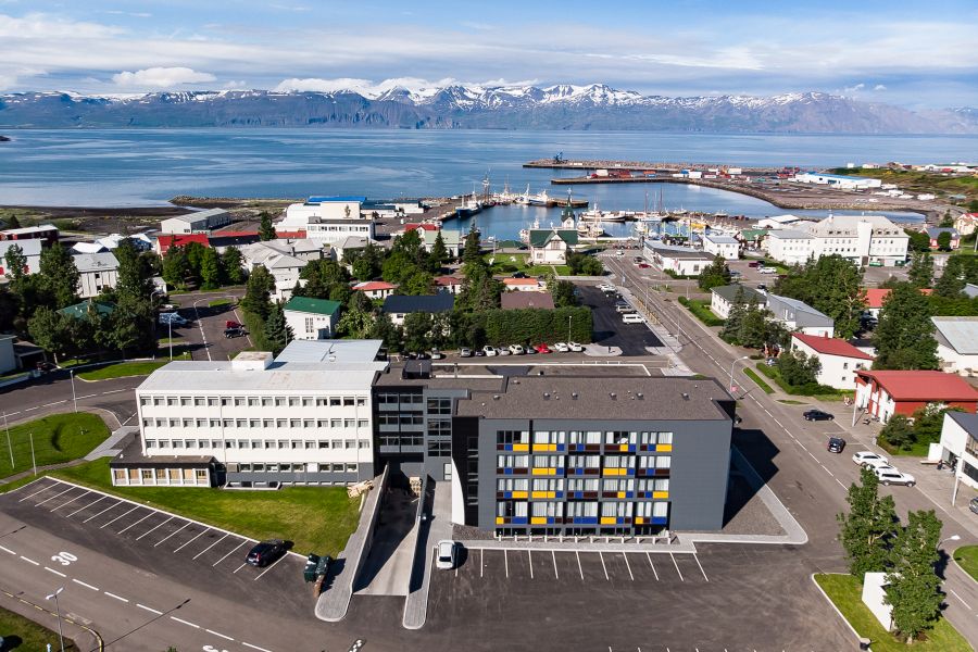 Uitstekend hotel in het centrum van Husavik, de walvishoofdstad van IJsland. Vanuit het pittoreske haventje van Husavik vertrekken meerdere keren per dag houten schepen om walvissen te observeren. De kans dat je ze ziet is 98%, ook worden vaak dolfijnen en vele soorten zeevogels (o.a. papegaaiduikers) waargenomen. Goed uitgangspunt voor tochten in de spectaculaire omgeving, bijv. naar de Asbyrgi kloof, de Dettifoss waterval, Namaskard met haar pruttelende modderpoelen en het Myvatn meer. Ruime lobby met receptie, goed restaurant & bar, lift, conferentiezalen. 110 kamers met douche/toilet, haardroger, telefoon, TV, radio, kluisje, koffie/theeblad, koelkastje en gratis wifi. De 47 superior kamers bieden meer ruimte en hebben beter uitzicht. Bij de haven zijn een aantal leuke restaurants. In Husavik vind je een walvismuseum en een 9 hole golfbaan. Myvatn 48 km, Asbyrgi 63 km, Dettifoss 92 km, Akureyri 91 km. Het hotel is gesloten van 1/12-28/2.