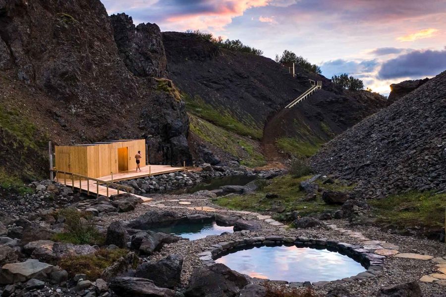 Je maakt een wandeling van ca. 1,5 km. met een gids door de ruige IJslandse natuur, waarbij o.a. de Langifoss waterval wordt bezocht, die in twee etappes naar beneden valt in de Deildargil canyon. De gids vertelt over het landschap en de hernieuwbare energie die in IJsland wordt opgewekt. Je passeert een stroompje van gesmolten gletsjerijs en de Okjökull. Deze voormalige gletsjer is ten prooi gevallen aan de opwarming van de aarde en heeft in 2014 officieel de benaming "gletsjer" verloren. De trip wordt afgesloten met een heerlijk bad van ca. een half uur in de geothermale Husafell Canyon Baths, met fraai uitzicht over de omringende bergen en gletsjers. Er zijn twee baden die in temperatuur variëren van 30 tot 41 graden en een koud dompelbad van 10 graden. Vertrek: vanaf het Husafell information Centre bij Hotel Husafell om 10.00, 13.00, 15.00 en 17.00 uurDuur: ca. 1 uur en 45 minuten. Max. 16 deelnemers.Prijs: € 76 per persoon. Kinderen 5 t/m 10 jaar gratis, 11 t/m 15 jaar betalen € 38.Inbegrepen: wandeling met Engelstalige gids, transport van/naar Hotel Husafell, entree voor de Husafell Canyon Baths en een handdoek.Kleding: je dient warme kleding en goede wandelschoenen te dragen. Neem zwemkleding mee (ook evt. te huur bij het zwembad van Hotel Husafell). Je dient in een redelijke fysieke conditie te zijn en kunnen lopen over een oneffen ondergrond. Er zijn 64 traptreden naar de Husafell Canyon Baths.