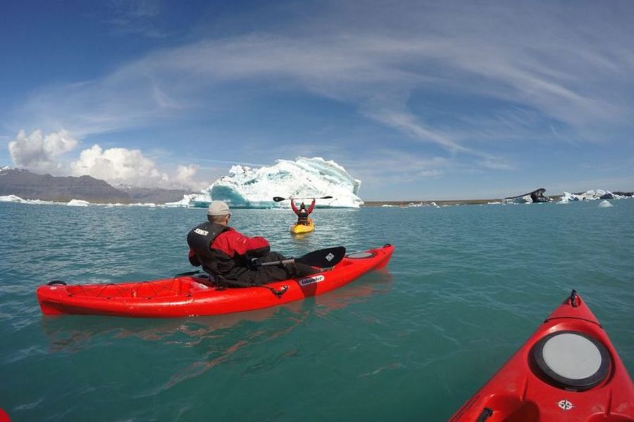 Peddel heerlijk met een kajak over het fascinerende ijsbergenmeer Jökulsarlon. Deze unieke tour is geschikt voor zowel beginners als ervaren kajakkers. Er wordt gebruik gemaakt van stabiele 2-persoons sit-on-top kajaks (1-persoons kajaks worden alleen gebruikt voor alleenreizenden of bij oneven aantallen) en de tour wordt begeleid door een ervaren instructeur, die uitleg geeft over het ontstaan van de ijslagune, de natuur en het dierenleven. Vaak zijn er zeehonden te zien tijdens de tour. Je peddelt rustig over het kalme water van de ca. 200 meter diepe lagune, die gevuld is met ijsbergen in alle soorten en maten, met uitzicht op de ijskap van de enorme Vatnajökull, de grootste gletsjer van Europa. Als het ijs net afgebroken is van de gletsjer hebben de ijssculpturen een diepblauwe kleur. Ook zie je zwarte en grijze lagen in sommige ijsbergen, ontstaan door de as van vulkanische erupties. Jökulsarlon heeft als decor gediend voor verschillende Hollywood films, zoals James Bond en Tombraider. Vertrek: dagelijks van 1/5-30/9 om 09.30, 10.30, 12.00, 13.00, 14.30, 15.30, 17.00 en 18.00 uur. Vertrekpunt: Jökulsarlon parkeerplaats