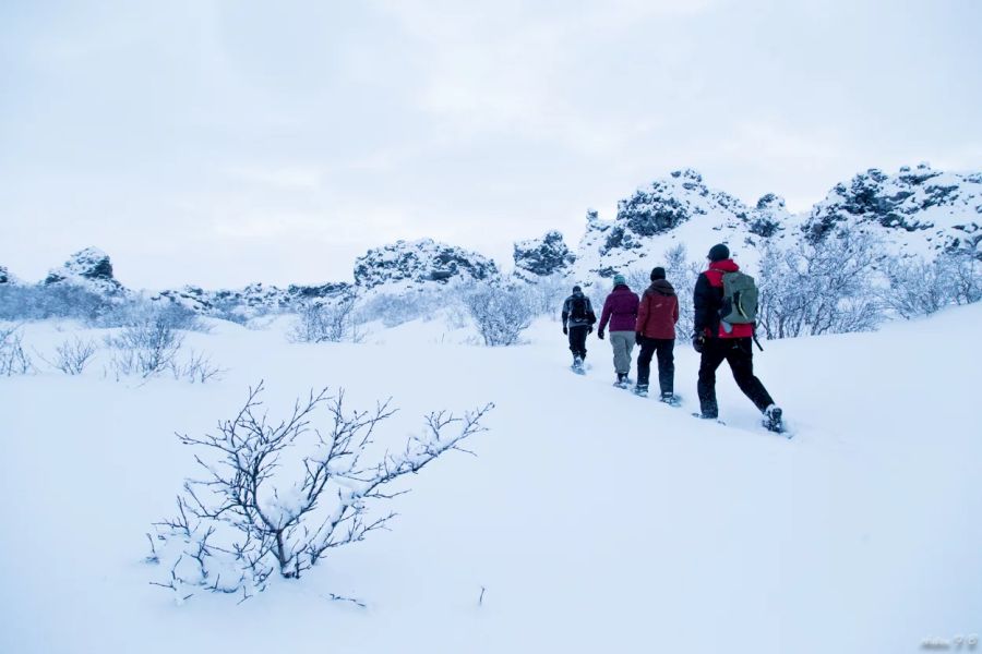 Met een IJslandse gids maak je een sneeuwschoenwandeling door het arctische landschap rondom het Myvatn meer, met geweldige uitzichten over de besneeuwde bergen en het bevroren meer. De vorm van sneeuwschoenen doen een beetje denken aan een tennisracket, die je gewicht over een groter oppervlakte verspreid, waardoor je niet te diep wegzakt in de sneeuw. Je kunt gebruik maken van stokken voor meer balans. Afhankelijk van het weer wordt elke dag bekeken wat de beste locatie is om te gaan wandelen. Je hebt de keuze uit een ochtendtour of een sunset-tour, aan het einde van de middag. Een erg leuke outdoor activiteit!