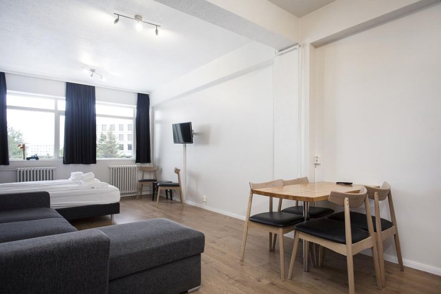 Modern ingerichte appartementen, gelegen op ca. 12 minuten lopen van het centrum. Uitzicht over de baai of de bergen. Er zijn 31 studio’s (18 m2) voor 2 personen, 12 familiestudio`s en 6 quad studio`s voor max. 4 personen (35 m2, met 2-persoons sofabed). Daarnaast zijn er nog grotere appartementen (88 m2) met 2 aparte slaapkamers met elk 3 bedden, woonkamer met sofabed en keuken, geschikt voor max. 6-8 personen, flatscreen TV, gratis wifi, kitchenette met koelkast, kookplaat en magnetron, badkamer met douche, wastafel, toilet en haardroger. Bedlinnen, regelmatig schone handdoeken en eindschoonmaak zijn inbegrepen. Lift, self service check-in, servicepersoneel is op afroep beschikbaar, je kunt gebruik maken van een wasmachine en droger. 10 minuten lopen van het grote overdekte winkelcentrum Kringlan, en vlakbij Laugadalur met een groot zwembad, fitnesscentrum, familiepark en botanische tuin. Gratis parkeren.