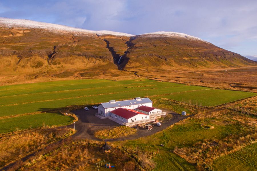 "Off The Beaten Track" country hotel, gelegen op een eenzaam schiereiland, met uitzicht op de Breidafjördur, de bergen en de eilandjes voor de kust. Ideaal voor rust- en natuurliefhebbers. Het hotel telt 18 tweepersoonskamers (20 m2), 8 Junior Suites (26 m2) en 4 superior kamers, alle met eigen badkamer, waterkoker, badjassen en gratis wifi. De Junior Suites zijn ruimer en hebben een zithoek met sofa. In het sfeervol ingerichte restaurant met bar worden uitstekende diners bereidt. De gasten kunnen gratis gebruik maken van een hottub en sauna. Barbecue hut beschikbaar voor de gasten. Kinderspeelplaats aanwezig. De eigenaar kan trips regelen naar een eilandje voor de kust met veel papegaaiduikers. 10 minuten lopen van het hotel ligt een fraaie waterval. Budardalur 55 km, Reykjavik 207 km. Vlakbij Budardalur ligt Eiriksstadir, met een replica van een Vikinghuis van Erik de Rode.
