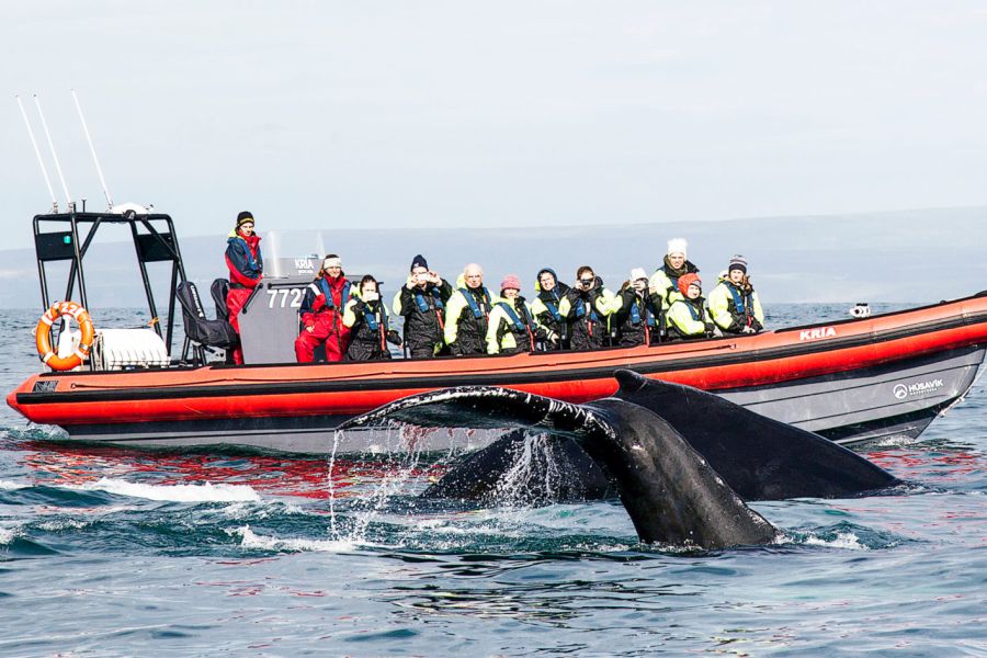 Vanuit de pittoreske haven van Husavik, de walvishoofdstad van IJsland, vertrekken dagelijks rib boat-excursies om van dichtbij walvissen en dolfijnen te kunnen observeren. Op 99% van de tours worden walvissen gespot. Daarnaast worden er vaak dolfijnen, zeevogels en papegaaiduikers gezien. Deze speciaal hiervoor ontworpen rib boten hebben plaats voor 12 personen en zijn erg snel (tot 80 km per uur) en kunnen daardoor verder de zee op gaan dan de traditionele schepen, waar de grotere walvissen zich bevinden. Tijdens het broedseizoen van de papegaaiduikers (1/5- 20/8) varen de boten ook langs Puffin Island, waar duizenden van deze kleurrijke vogels nestelen.Duur: ca. 2 uur