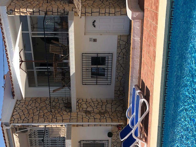 Aan de voorzijde van de woning is een groot zwembad aanwezig, letterlijk recht voor de deur!
