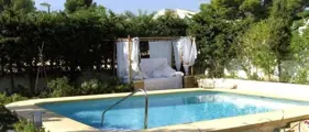De woonkamer grenst achter aan een groot terras met uitzicht op zee en bergen.Een schaduw rijke plek om in de avond heerlijk rustig te eten.De woonkamer beschikt over airco en TV met satelliet en internet.Er zijn twee slaapkamers beide voorzien van airco met ieder een eigen badkamer. Een badkamer met ligbad en bidet/wc en de andere met douche/wc en wasmachine. Een 3e slaapkamer beschikt over twee eenpersoonsbedden met wastafel.
