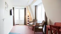 De tweepersoonskamer is voorzien van een zithoek met flatscreen lcd-tv, koffie- en theefaciliteiten en een kluisje. De badkamer heeft een bad en/of douche, wastafel, toilet en een föhn.