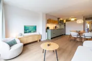 Appartement op de 1e etage. Entree, ruime woonkamer met een zithoek, TV en een eethoek met eettafel voor 4 personen. De nette open keuken is van alle gemakken voorzien zoals een vaatwasser, koelvriescombinatie, combimagnetron en verschillende koffiezetapparaten. Er zijn twee slaapkamers aanwezig welke beide zijn voorzien van 2 eenpersoons boxspring bedden. Eén slaapkamer ligt in het midden van het appartement waardoor er geen raam met zicht naar buiten aanwezig is. De nette badkamer is uitgerust met een ligbad, douche en dubbele wastafel. Het toilet is apart gesitueerd. Vanaf het balkon heb je een prachtig uitzicht over de Noordzee, de duinen en badplaats de Koog. Er is standaard tuinmeubilair aanwezig.