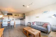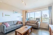 Entree, woonkamer met zithoek, tv en een eethoek met eettafel voor 4 personen. De open keuken is van alle gemakken voorzien zoals een vaatwasser, inductiekookplaat, magnetron, heteluchtoven en verschillende koffiezetapparaten. Er zijn twee slaapkamers aanwezig, welke beide voorzien zijn van twee eenpersoons boxspring bedden. Eén slaapkamer is gelegen in het midden van het appartement waardoor er geen raam naar buiten aanwezig is. De badkamer is voorzien van een inloopdouche en dubbele wastafel. Het toilet is apart gesitueerd. Openslaande deuren naar het terras met fantastisch uitzicht over zee en duinen. Tuinmeubilair is aanwezig.