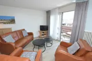 Dit appartement ligt op de eerste verdieping. De woonkamer heeft een eethoek en een zithoek met tv. De open keuken is ingericht met koelkast, 4-pits elektrische kookplaat, magnetron en koffiezetapparaat. In de slaapkamer staan twee eenpersoons bedden. De badkamer heeft een douche en wastafel. Er is een apart toilet. Het appartement heeft een balkon. Tuinmeubilair is aanwezig.