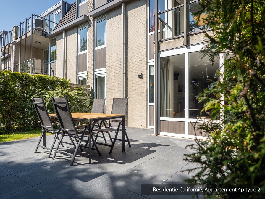 Dit comfortabele appartement type 2 ligt op de begane grond. De woonkamer heeft een zithoek met tv, radio, CD-speler en DVD-speler. Tevens is er een eethoek. De open keuken is ingericht met 4-pits elektrisch comfort, koelkast met vriesvak en magnetron. Er zijn twee slaapkamers, waarvan één met tv. De badkamer beschikt over een ligbad en douche en er is een apart toilet. Dit appartement heeft een terras. Tuinmeubilair is aanwezig.