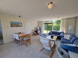 De ruime woonkamer van deze geschakelde bungalow heeft woonkamer met eethoek, zithoek en tv. De keuken is goed uitgerust met een vaatwasser, koelkast met vriesvak, gasfornuis, magnetron, waterkoker en een koffiezetapparaat. De grote slaapkamer met 2 eenpersoonsbedden (90x200) en eigen wastafel is bereikbaar vanuit de woonkamer. De tweede slaapkamer is bereikbaar via de keuken en heeft 1 eenpersoonsbed en een stapelbed (90x200 cm). Badkamer met douche, wastafel en toilet. Via de schuifdeur in de woonkamer kom je in de fijne achtertuin met tuinmeubels.