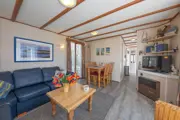 De woonkamer is voorzien van eethoek en zithoek met gaskachel, flatscreen tv, radio en cd-speler. De open keuken is ingericht met gasstel, koelkast, koffiezetapparaat, Senseo en waterkoker. Er zijn twee slaapkamers waarvan een met 1 tweepersoonsbed (200 x 150) met daarop een tweepersoons dekbed (200 x 200) (of 2 eenpersoons dekbedden (140 x 200 Op aanvraag). De andere slaapkamer heeft 2 eenpersoons bedden voorzien van dekbedden van 140 x 200). Er is een badkamer met standaarddouche en stortdouche en toilet. Het chalet heeft een terras op het zuiden. Tuinmeubilair en parasol aanwezig. In de afsluitbare fietsenberging bevindt zich een combi-magnetron, een vrieskast en ruimte om elektrische fietsen op te laden.
