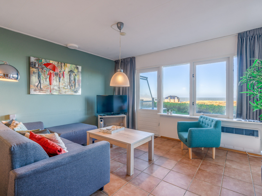 Ruim 2-persoons zeezicht appartement op de begane grond. Entree, woonkamer voorzien van een zithoek met Smart-tv en eethoek met eettafel voor 4 personen. De open keuken is uitgerust met o.a. een vaatwasser, magnetron, koelvriescombinatie en verschillende koffiemachines. Er is één slaapkamer aanwezig, welke voorzien is van twee eenpersoons bedden en een Smart-tv. De badkamer is voorzien van een ligbad, aparte douche en een wastafel. Het toilet is apart gesitueerd. Vanaf het terras heb jeeen prachtig uitzicht over de Noordzee. Tuinmeubilair is aanwezig.