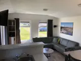 In de woonkamer van het chalet staan een bank, een flatscreen tv en een eethoek. Het chalet heeft openslaande deuren naar de tuin. De open keuken is ingericht met een 4-pits gaskookplaat, koelkast met vriesvak, magnetron, filter koffiezetapparaat en waterkoker.