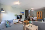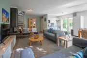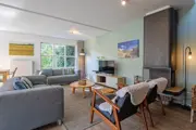 De woonkamer biedt genoeg plaats voor het hele gezelschap en is voor zien van een zit- en eethoek, televisie en een open haard. De open keuken is o.a. voorzien van een vaatwasser en magnetron. Er zijn 3 slaapkamers waarvan 1 op de begane grond. Allen met twee eenpersoonsbedden. Op de begane grond een separaat toilet en een badkamer met brede wastafel en ruime inloopdouche. Op de eerste verdieping een badkamer met ligbad, wastafel en toilet. Deze geschakelde, uitgebouwde bungalow heeft een grote tuin met terras.