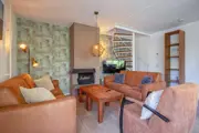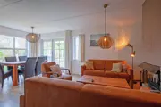 De woonkamer is voorzien van een zit- en eethoek, televisie en een open haard. De open keuken is o.a. voorzien van een vaatwasser en combimagnetron. Er zijn 3 slaapkamers waarvan 1 op de begane grond, allen met een eenpersoonsbed. Er zijn twee badkamers aanwezig: op de begane grond een badkamer met bad, toilet en wastafel, op de eerste verdieping een badkamer met douche, toilet met wastafel. Deze geschakelde bungalow heeft een grote tuin met terras.