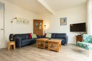 Ruime, lichte woonkamer met open haard (hout zelf meebrengen), eethoek, zithoek, televisie en DVD-speler. De moderne open keuken is compleet ingericht met o.a. 6-pits gasfornuis, vaatwasser, oven, magnetron, filterkoffiezetapparaat, Senseo en Nespresso apparaat. Een slaapkamer is voorzien van tweepersoonsbed, wastafel en televisie. De andere slaapkamer heeft 2 eenpersoonsbedden en televisie. Alle bedden zijn 2.10 m lang. Badkamer met douche, toilet en wastafel. De schuifpui geeft toegang tot het gedeeltelijk overdekte terras en de afgesloten ruime tuin op het zuidwesten.