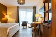 De Deluxe kamer is voorzien van boxspringbedden met Texeler dekbed en een zitje, tv en bureau. De badkamer heeft een regendouche, wastafel, toilet, toilet artikelen, een scheerspiegel, föhn en luxe badjassen en sloffen. Je hebt uitzicht over de tuin of de landerijen rond het hotel. De kamer is gelegen op de begane grond en heeft een terras.