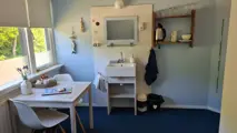 De kamer op de bovenverdieping heeft twee eenpersoonsbedden, een tv en een eethoek. Een koelkast met vriesvakje en waterkoker zijn aanwezig. Er is een wastafel in de kamer. De gedeelde badkamer heeft een douche en toilet.