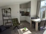 Chalet type G heeft een gezellige woonkamer met zithoek, eethoek en smart-tv. De open keuken heeft een koffiezetapparaat en waterkoker. Een slaapkamer met een twee eenpersoons bedden. Deze zijn geschakeld. De tweede slaapkamer heeft twee aparte eenpersoons bedden. In de badkamer vind je de douche, wastafel en toilet. Terras met tuinmeubels en een overkapping achter aan het chalet.
