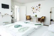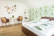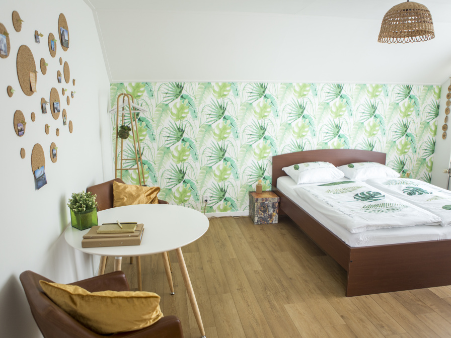 Deze kamer op de eerste verdieping heeft een tweepersoons bed , zitje, koelkast, Senseo koffiezetapparaat, waterkoker en servies. De badkamer en suite heeft een douchecabine, wastafel, föhn en toilet.