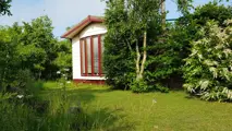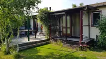 Het chalet heeft een zeer ruime tuin (220 m2) met een zitje bij één van de vijvers onder een plataan en een verhoogd, tegen de wind beschut terras aan het chalet met tuinmeubilair en parasol. De tuin is zo ingericht dat je volledig vrij zit.