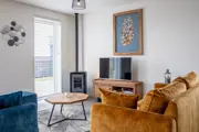 De moderne woonkamer is voorzien van een smart TV en pellethaard. Er is een eethoek met een gezellige ronde eettafel voor vier personen. De open keuken is uitgerust met een inductiekookplaat, koelkast met vriesvak, oven, vaatwasser, Nespresso en filter koffiezetapparaat. In de hal bevindt zich een separaat toilet. Op de bovenverdieping zijn twee slaapkamers. De “masterbedroom” is zeer ruim met openslaande deuren met ieder een Frans balkon. Deze slaapkamer heeft twee eenpersoons boxspringbedden met een tweepersoons topdekmatras. De tweede slaapkamer heeft ook twee eenpersoons boxspringbedden. De ruime badkamer is voorzien van een ligbad, inloopdouche, wastafel en toilet. Dit vakantiehuis heeft een zonnige tuin met een terras op het zuiden met een heerlijke overkapping. Vanuit de woonkamer loopt je via de schuifpui direct het terras met overkapping op. Het terras en de ruime tuin liggen op het zuiden. Tuinmeubilair en een parasol is aanwezig.
