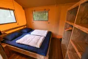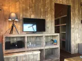 De voorruimte van de lodge bestaat uit een zithoek met tv en een eethoek. De open keuken is ingericht met 4-pits gaskookplaat, een grote koelkast met vriesvak, koffiezetapparaat en waterkoker. Er is een slaapruimte met een tweepersoonsbed (2 matrassen samen 160 x 200) en een slaapruimte met een hoek stapelbed. De badkamer heeft een wastafel, toilet en regendouche. Onder de overdekte veranda staat een lounge set. Er is een pelletkachel, draadloos internet en een kluisje aanwezig.