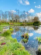 Alle kamers zijn twee eenpersoons boxspring bedden die op basis van het aantal personen voor u voor aankomst wordt opgemaakt. De bedden kunnen vastgehaakt worden als twee persoons bed. Er is een eigen terras met tuin (via openslaande tuindeuren) met terrasmeubilair. Het huis ligt op een prachtig landgoed, omringd door bomen en grenzend aan weilanden.