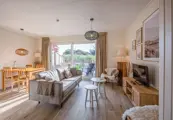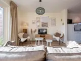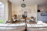 De woonkamer van dit comfortabele, geschakelde vakantiehuis heeft een eethoek en een zitbank met bank, twee fauteuils, TV en radio. Vanuit de woonkamer heb je uitzicht op het terras en de gezamenlijke tuin. De keuken is van alle basisbenodigdheden voorzien en ingericht met een 4-pits gasfornuis, koelkast met vriesvak, waterkoker, Nespresso en filter koffiezetapparaat. Op de benedenverdieping is de badkamer, met toilet, inloopdouche en handdoekradiator. Vanuit de hal bereik je de bovenverdieping met twee slaapkamers. De grote slaapkamer heeft een tweepersoonsbed met twee eenpersoonsdekbedden, een kast en wastafel. De tweede slaapkamer heeft twee eenpersoonsbedden, een kast en een wastafel. Bij aankomst zijn de bedden voor jullie opgemaakt. Vanuit de woonkamer kun je naar het terras met tuinmeubilair, gelegen op het zuiden.