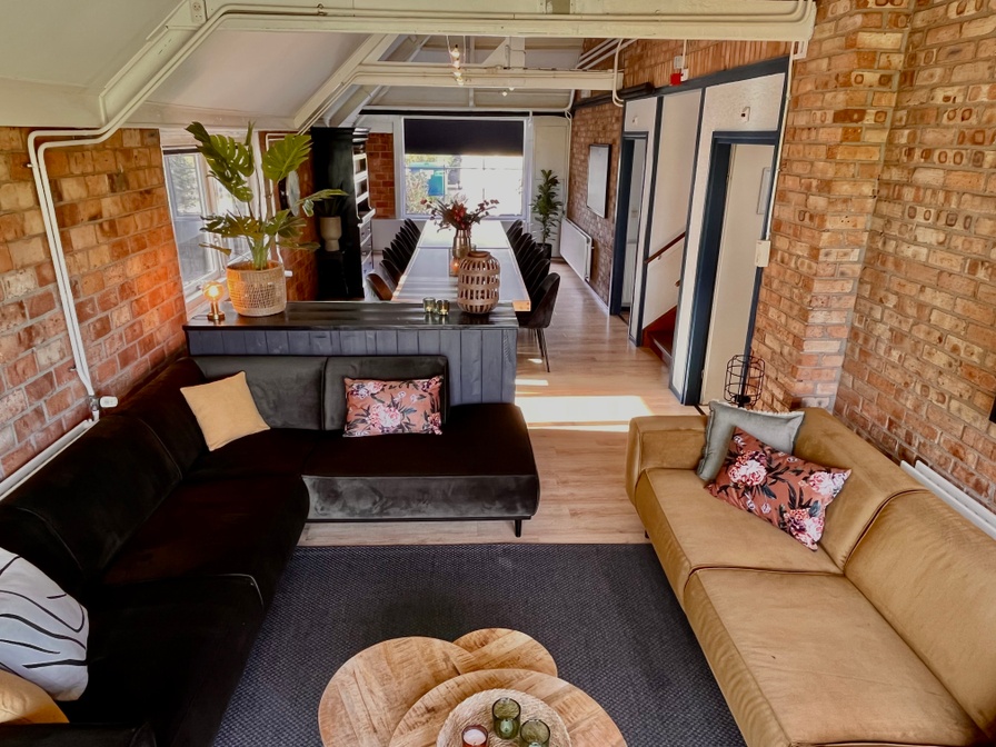 De ruime woonkamer heeft twee lange eettafels met relaxte zitstoelen en een gezellige zithoek met flatscreen-tv. De combinatie van twee heerlijke lounge-banken maakt het fijn zitten met elkaar. In de woonkamer bevindt zich een kast vol boeken en spelletjes. Er is een aparte keuken met complete inrichting, waaronder een vaatwasser, Nespresso-apparaat en filter- koffiezetapparaat, twee koel-vries combinaties, 4 elektrische kookplaten en 2 warmhoud platen. Op de begane grond zijn vier slaapkamers met elk 2 eenpersoons bedden, twee slaapkamers met elk 1 stapelbed en een slaapkamer met 1 eenpersoons bed. De drie badkamers hebben elk een wastafel, douche en toilet. Er is nog een extra apart toilet. Op de eerste verdieping zijn nog eens vier slaapkamers met elk 2 eenpersoons bedden en een eigen wastafel. Hier zijn twee badkamers met wastafel, douche en toilet. Er is een afgesloten tuin met terras met tuinmeubels. Voor de kinderen zijn er schommels en een groot voetbalveld.