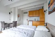 De woonkamer van deze studio - die op de tweede etage ligt - heeft een eethoek met tv en twee eenpersoons bedden. De open keuken is ingericht met een gasfornuis, koelkast, magnetron, koffiezetapparaat en waterkoker. De badkamer heeft een ligbad met handdouche, wastafel en een toilet. Je beschikt over een fijn balkon met zitje. Deze studio bevindt zich op de tweede etage van het appartementencomplex. Er is geen lift aanwezig.