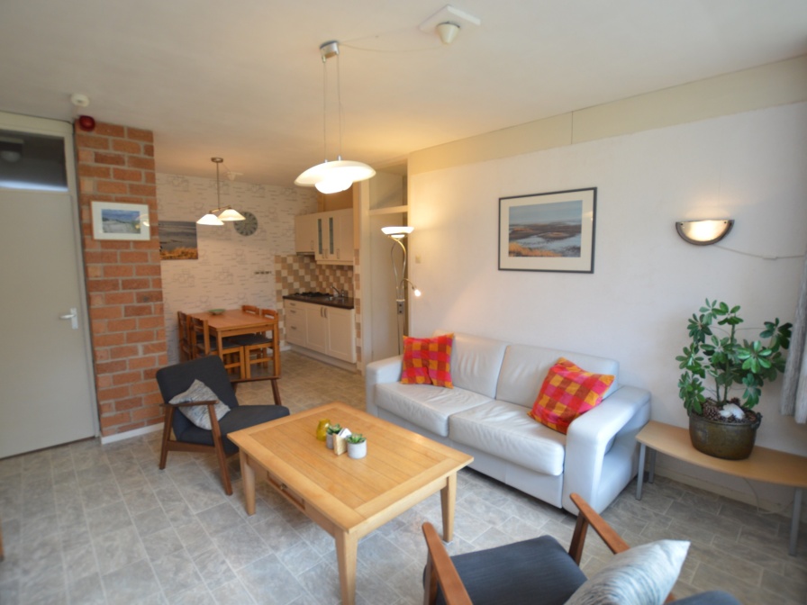 Dit nette appartement ligt op de begane grond van het appartementengebouw. De woonkamer heeft een zithoek met tv en een tweepersoons bedbank. De open keuken is ingericht met een koelkast, 4-pits gaskookplaat , koffiezetapparaat, combimagnetron en eethoek. In de slaapkamer staan 2 eenpersoons bedden met 1 persoons dekbedden. De badkamer heeft douche, wastafel en toilet. Dit appartement heeft een afgesloten balkon aan de tuinzijde. Tuinmeubilair is aanwezig.