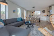 Ruime entree met aangrenzende bijkeuken. De woonkamer is voorzien van zithoek met smart-tv en netwerk/bluetooth speaker. De open keuken is ingericht met onder andere inductiekookplaat, combi-magnetron, koelkast, vriezer, vaatwasser, Quooker, koffiezetapparaat en Nespresso machine. Er is een extra, separaat toilet. De slaapkamer op de begane grond is voorzien van 2 eenpersoons boxspringbedden (200 lang) en smart-tv. De aangrenzende badkamer heeft een douche met handgrepen, wastafel en toilet.