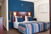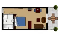 De kamer heeft een zithoek met LCD-tv en een eethoek. Een koelkastje en koffie/thee faciliteiten zijn aanwezig. In het slaapgedeelte staat een tweepersoons boxspring bed. De luxe badkamer heeft een ligbad, douche en toilet. Deze ruime kamer heeft een terras met zitje.