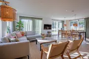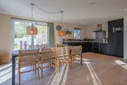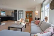 De ruime woonkamer met zithoek en sfeerhaard heeft veel lichtinval. Moderne, luxe open keuken met eethoek met o.a. oven, vaatwasser, filterkoffiezetapparaat en Nespresso. Slaapkamer met 2 eenpersoons boxspringbedden en badkamer met inloopdouche en toilet. Separaat toilet. Grote bijkeuken met wasmachine en droger. Op de verdieping zijn 3 slaapkamers met elk 2 eenpersoons boxspringbedden. Badkamer met ligbad, inloopdouche en dubbele wastafel. Apart toilet. De overloop is voorzien van een traphekje. Drie schuifpuien geven toegang tot het terras op het zuiden en de grote tuin. Alle schuifpuien en slaapkamerramen zijn voorzien van horren.
