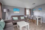 Dit chalet ligt aan de rand van het park. De woonkamer heeft een zithoek met flatscreen tv en een eethoek. De open keuken is ingericht met een koelkast met vriesvak, combi-oven, vaatwasser, waterkoker en Senseo. Er zijn twee slaapkamers, waarvan een met 2 eenpersoons boxspringbedden (80 x 200). De andere slaapkamer heeft 1 eenpersoons boxspringbed (80 x 200) en 1 stapelbed (80 x 200). Er is een badkamer met douche, wastafel en toilet. Het chalet heeft een groot terras en een eigen parkeerplaats voor je auto. Tuinmeubilair is aanwezig.