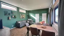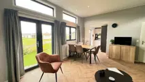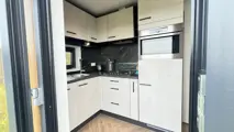 Modern 5-persoons chalet. Ruime indeling met midden woonkamer, twee slaapkamers en een ruime badkamer. Het chalet is rook- en huisdiervrij. De keuken is voorzien van een vaatwasser en een magnetron.