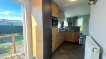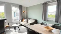 Entree, woonkamer met een bank, een flatscreen tv en een eethoek. De open keuken is ingericht met een 4-pits gaskookplaat, koelkast met vriesvak, filter koffiezetapparaat en waterkoker. Er zijn twee slaapkamers waarvan een met een tweepersoons boxspringbed (2 matrassen van 80x200). In de andere slaapkamer staat een stapelbed waarvan zowel het onderste als het bovenste bed opklapbaar is. De badkamer is uitgerust met douche, wastafel en toilet. Het chalet heeft een tuin met een schuurtje en tuinmeubilair. De parkeerplaats is direct naast het chalet.