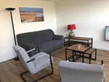 De woonkamer heeft een zithoek met flatscreen smart-tv. Er is een eethoek met drie stoelen. De open keuken is ingericht met een combi-oven, inductiekookplaat, koelkast met vriesvak, vaatwasser, filter koffiezetapparaat en waterkoker. Er zijn twee slaapkamers, waarvan één met tweepersoonsbed (1.60 x 2.00). De andere slaapkamer heeft een eenpersoonsbed. De badkamer is voorzien van douche, wastafel en toilet. De vakantiewoning heeft een terras aan de voorzijde en aan de achterzijde.