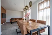 Entree via hal met toilet. Woonkamer zithoek, eethoek en smart tv. Open keuken met o.a. vaatwasser, koelkast met diepvriesvak, Quooker kraan, oven, inductiekookplaten met downdraft afzuigsysteem. Je hebt hier een koffiecup machine, een senseo en een snelfilter koffiezet apparaat. Slaapkamer met 1 tweepersoons bed en ensuite badkamer met regendouche, dubbele wastafel en toilet. Op de eerste verdieping vind je de tweede en derde slaapkamer, elk met 2 eenpersoons bedden. Tweede badkamer met regendouche, dubbele wastafel en toilet. Vanuit de woonkamer kom je via openslaande deuren op het terras met tuinmeubelen. Fijn gazon met uitzicht.