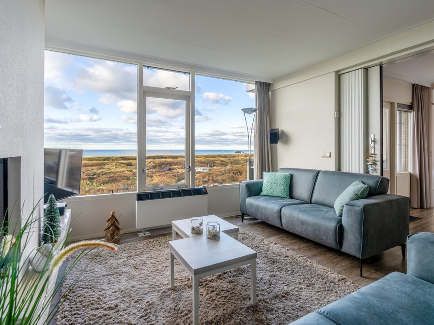 Dit tweepersoons appartement bevindt zich op de eerste etage. De ruime woonkamer heeft lichte en sfeervolle zithoek met comfortabele bank, televisie, sierhaard en eethoek voor vier personen. Grote ramen met uitzicht richting de duinen en directe toegang tot het balkon. De nette open keuken is van alle gemakken voorzien zoals een vaatwasser, combimagnetron, koel-vries combinatie en diverse koffiemachines. Er is een slaapkamer met een boxspringbed met twee eenpersoons matrassen. Ruime badkamer met ligbad, aparte douche en dubbele wastafel. Separaat toilet. Balkon met uitzicht over de duinen en de Noordzee, tuinmeubilair is aanwezig.